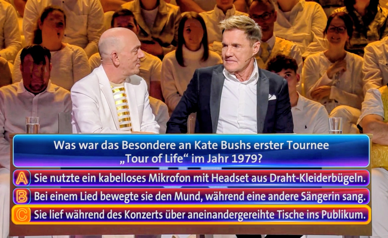 Erste Rubrik: Musik! „Das nehmen wir, sonst kriegen die das“, sagt Dieter. Es war die Kate Bush-Frage, die sie komplett versemmelten! „Ich dachte, da kommt was vernünftiges!“, und zwar was von Modern Talking, meint der Pop-Titan witzig, als alle Antworten vorgestellt waren. Bernhard daraufhin: „Nein, nein, es geht hier um Musik…“ und schießt damit den Vogel ab, weil er auf die Mucke von Blue System und co, einem gewissen Grad an Niveau anspielt!! Dieter würgt ihn daraufhin… Natürlich nur aus Spaß.